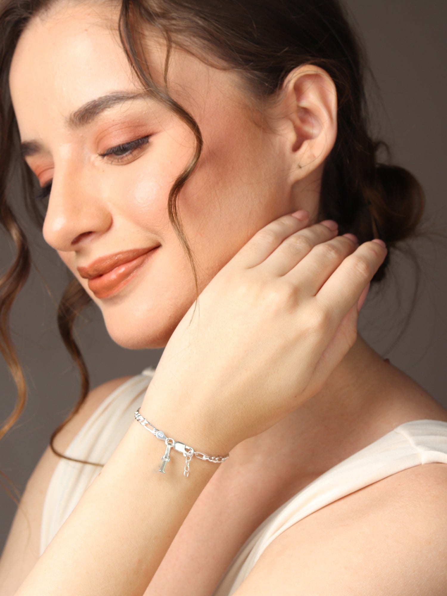 92.5% pure Sterling Silver Figaro Designer Bracelet with I Alphabet for Girls and women