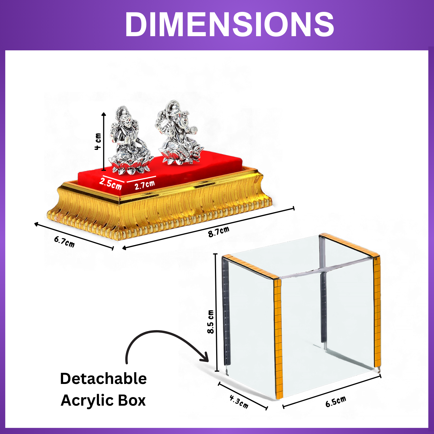 Celebrate tradition and invite positive energy with this pure silver Ganesh and Laxmi idol combo by Akshat Sapphire. Made from 99.9% silver, these idols are precisely crafted with fine detailing that reflects divine elegance and purity. Each set comes with a removable acrylic box that protects the idols from dust and damage, helping maintain their shine and longevity. Whether placed in your home mandir, on a car dashboard, study table, or office desk, this compact and versatile combo brings peace, prosperity, and spiritual charm to any space. Perfect for Diwali, Dhanteras, weddings, or housewarming gifts — it’s a thoughtful blend of devotion, design, and durability.