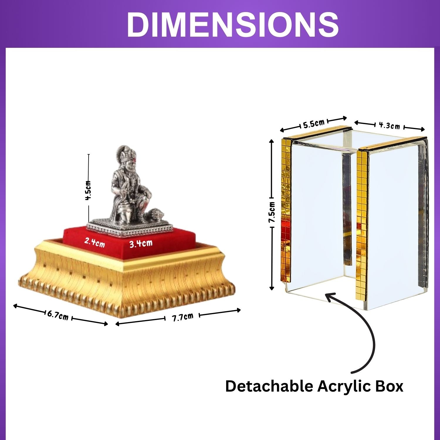 Experience the divine strength and unwavering devotion of Hanuman Ji with this striking idol by Akshat Sapphire, crafted from 99.9% pure silver. this idol embodies courage, protection, and spiritual strength. Encased in a dustproof, crystal-clear acrylic display box, it ensures both beauty and durability. Ideal for your home mandir, office space, or as a meaningful gift for loved ones, this piece is a perfect blend of divine grace and masterful craftsmanship — a true symbol of faith and inspiration.