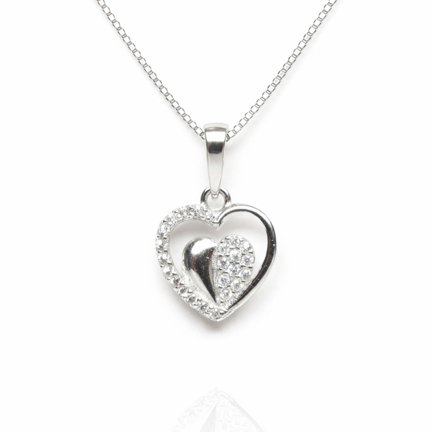 "Add a touch of elegance and romance to your jewelry collection with this Open Heart Sterling Silver Pendant with 18 inches box Chain. Expertly crafted from 92.5 pure sterling silver, this pendant features a graceful open-heart outline paired with a smaller inner heart encrusted with shimmering stones, creating a beautiful contrast of polish and sparkle.The pendant is complemented by a strong and stylish 18 inches box chain, known for its durability and smooth finish. Lightweight and comfortable, this piece is ideal for daily wear, office wear, and special occasions, making it a versatile addition to any wardrobe.